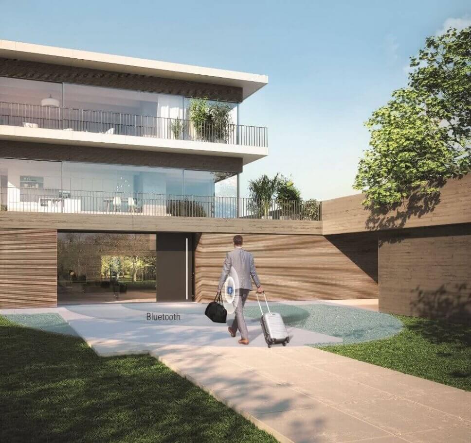 Das Zutrittskontrollmodul Schüco BlueCon ermöglicht dank Bluetooth-Technologie eine sichere und schlüssellose Bedienung der Haustür über das eigene Smartphone