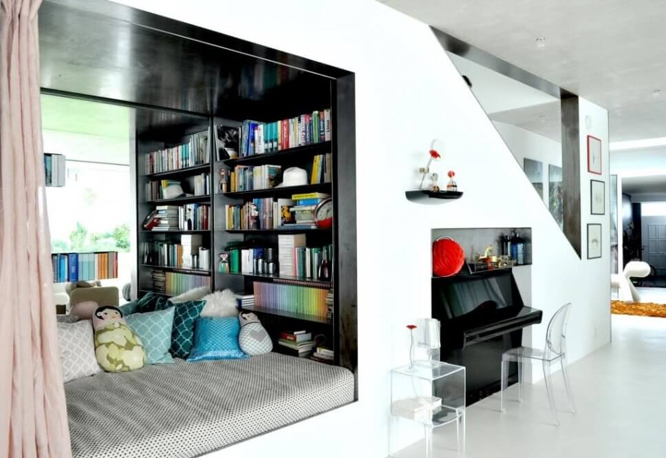…zum Beispiel fürs Klavier. Oder die Box unter der Treppe mit Bibliothek und Bett zum ungestörten Schmökern…