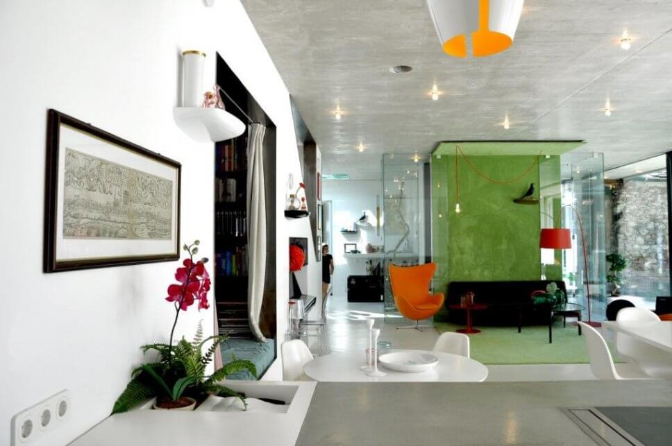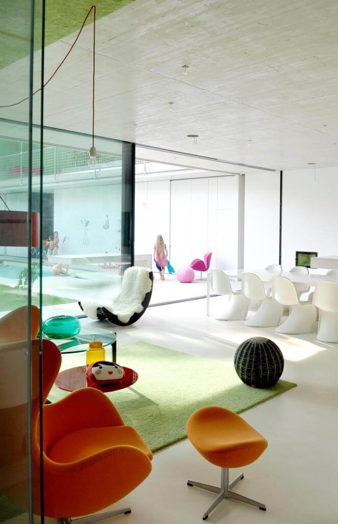 …trotz der großzügigen Weite wirkt das Erdgeschoss behaglich. Das liegt zum einen an der erlesenen Auswahl von Designklassikern in starken Farben, die die Wohnhalle bevölkern…