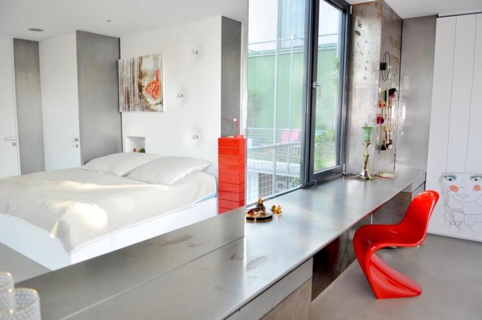 …der Mix macht’s auch im ersten Geschoss: Hier kombinieren die Bauherren das Schlafzimmer mit einem langen Schreibtisch…