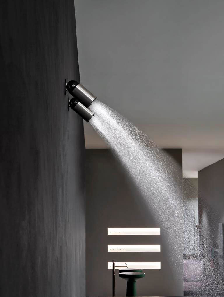 …nicht minder minimalistisch kommt die Duscharmatur Azimut aus der toskanischen Designschmiede daher. Sie beschränkt sich auf einen höchst beweglichen Zylinder, der dem Hauptakteur Wasser die Bühne überlässt