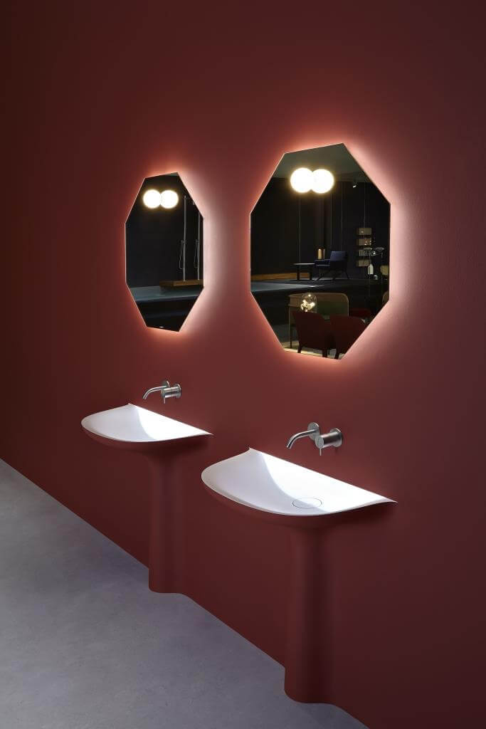 Wahrhaft sparsam in Form und Materialstärke modellieren Mario Ferrarini und Domenico De Palo ihr Waschbecken Calice für Antoniolupi. Das in Corian® gearbeitete Becken wird erst nach Anbau verputzt und gestrichen, so verschmilzt es förmlich mit der Wand…