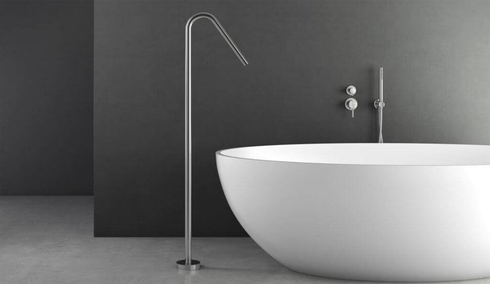 …jetzt bringt das junge Boutique-Label seine erste eigene Armaturenkollektion aus Edelstahl heraus, hier der puristische Wanneneinlauf Como 08 samt Thermostatmischer und Handbrause