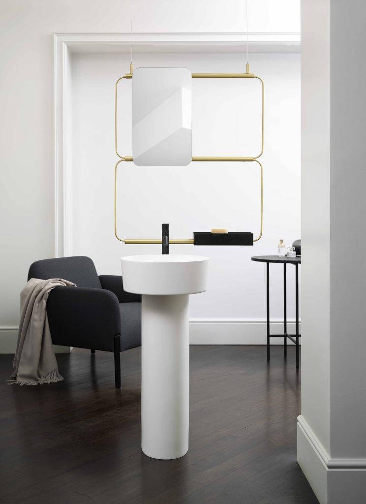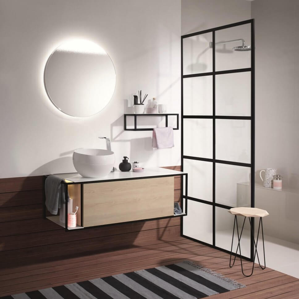 In coolem Look präsentiert sich Junit von Burgbad, ein filigraner Metallrahmen mit einem kleiner dimensionierten Schrank, der wie passgenau darin eingeschoben wirkt, dabei aber Freiräume für Ablagen lässt