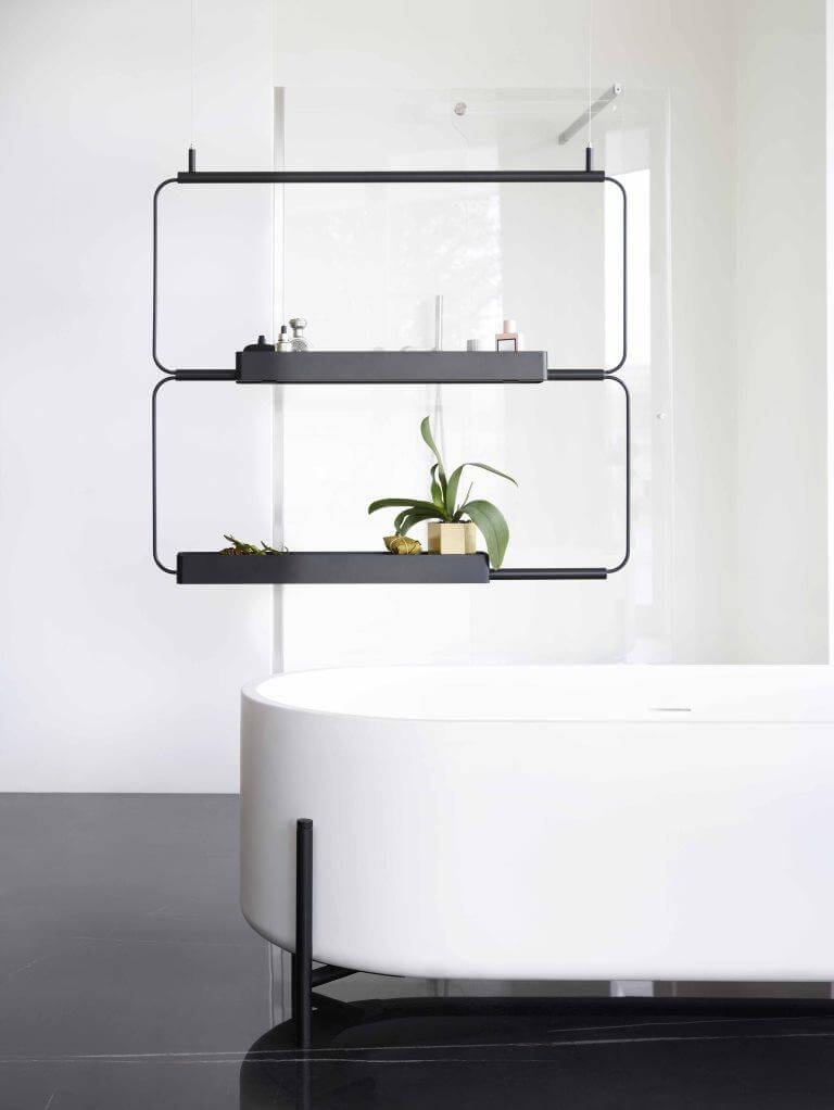 …das streng geometrische Nudo nimmt Spiegel, Ablagen, Handtuchhalter, sogar Blumentöpfe auf, und wirkt dabei überhaupt nicht verspielt