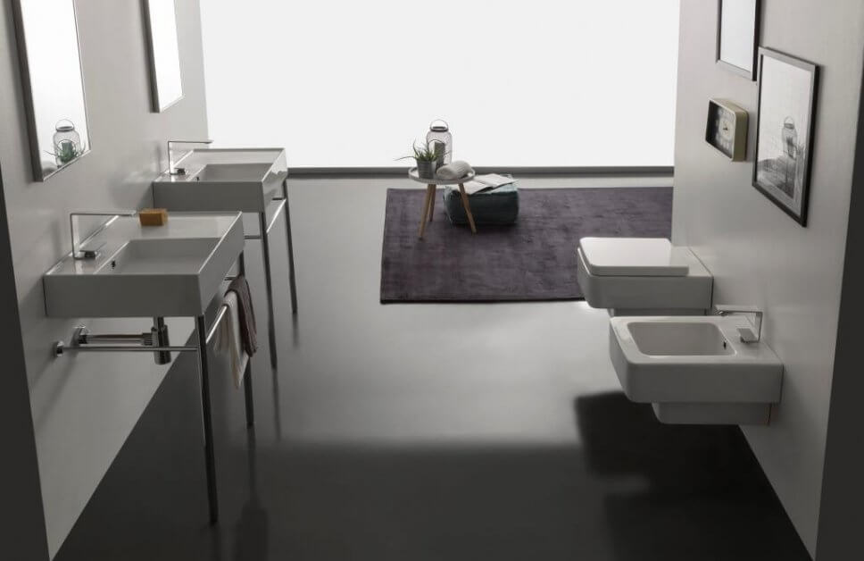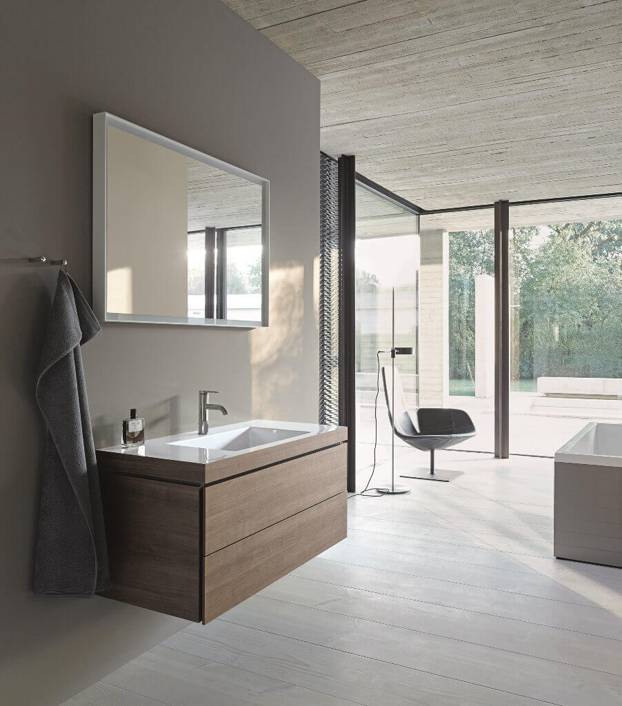 Das Rechteck symbolisiert die Vero Air-Serie von Duravit. Dank eines aufwändigen Produktionsprozesses verschmilzt hier der Waschtisch praktisch nahtlos mit dem Möbel