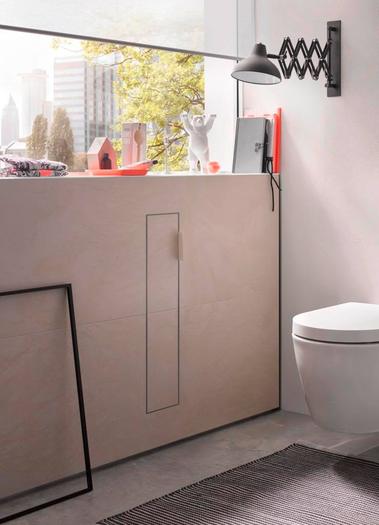 Ganz dezent in der Wand verschwindet Emcos neues WC-Modul der asis-Reihe. Es verbirgt hinter der Glasfront Papierhalter und Toilettenbürstengarnitur auf kleinstem Raum