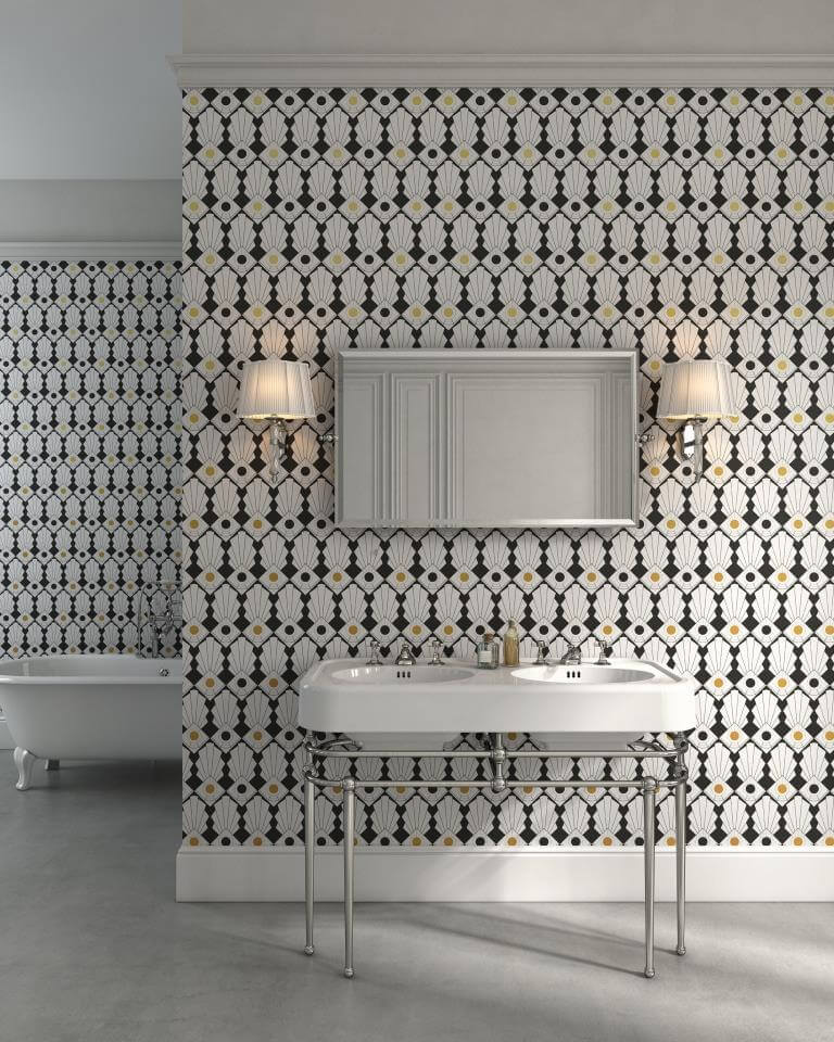 Devon & Devon, berühmt für ihre erlesene Badkeramik, engagieren Designer Vito Nesta, um einen ebenbürtigen Hintergrund für diese zu schaffen – Majestic Gold heißt seine abwaschbare Tapete