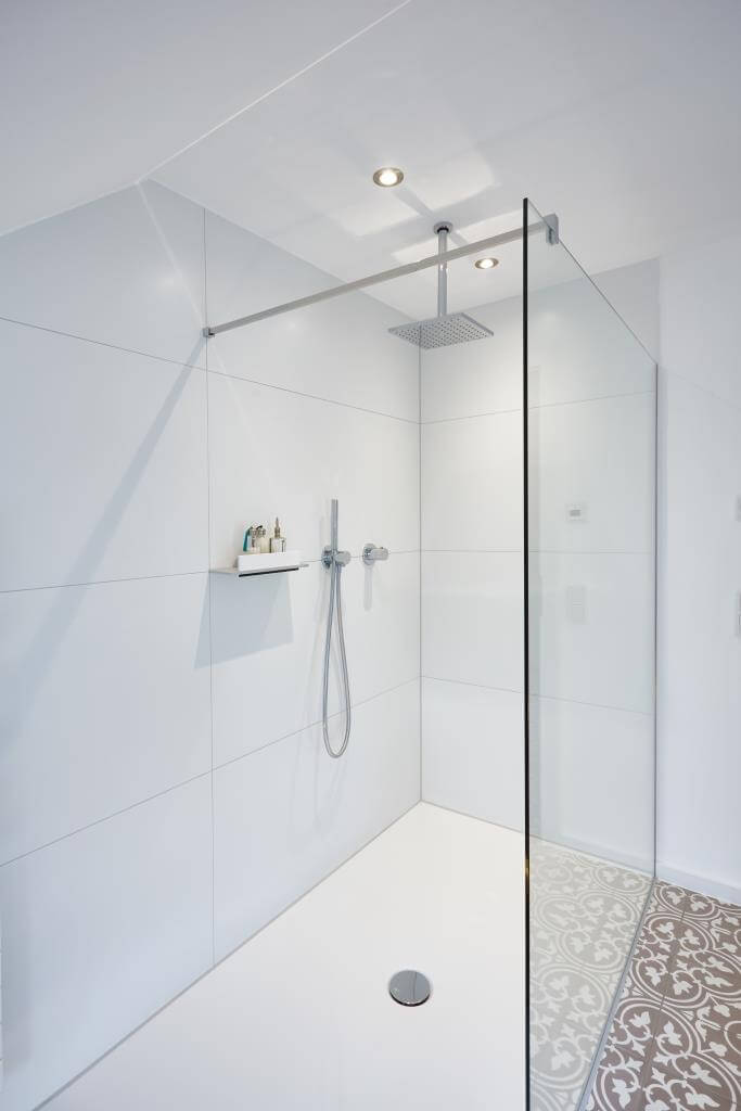 …kaum wahrzunehmen trennt eine gläserne Spritzwand die bodenebene Dusche und gibt dem Raum so zusätzliche Tiefe…