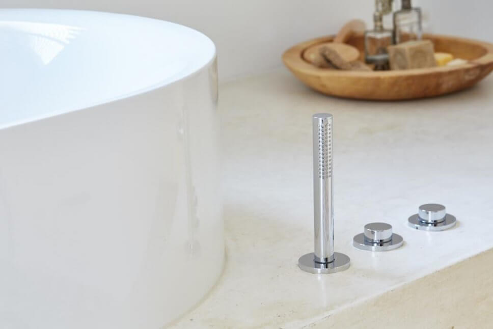 …die gleiche Serie wählt die Innenarchitektin für die Wanne, lässt die Armaturen halb in das Podest ein…