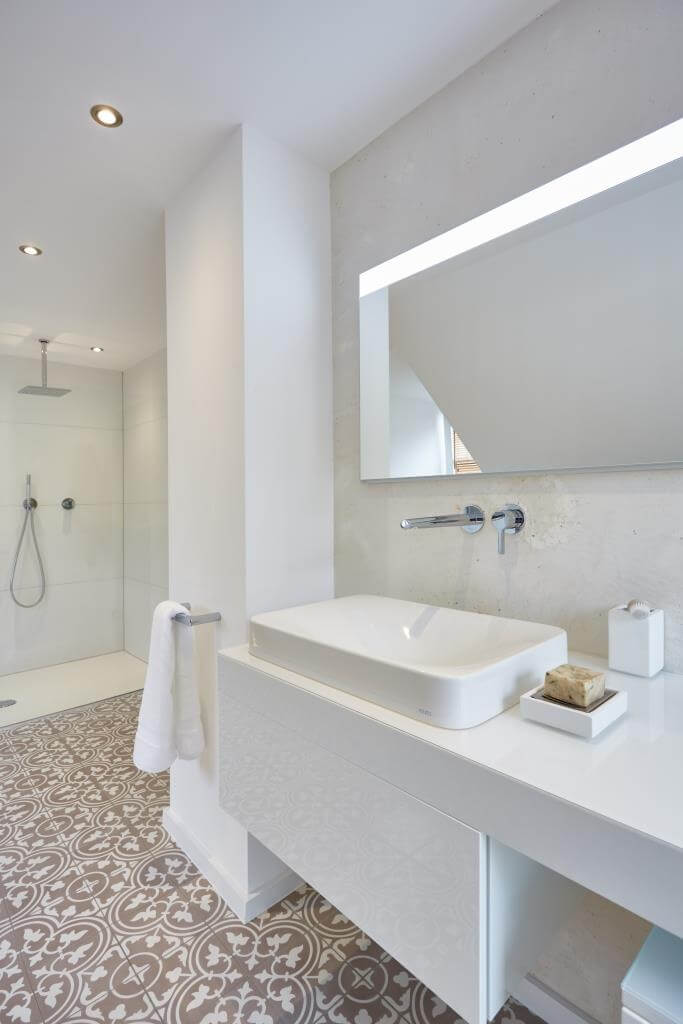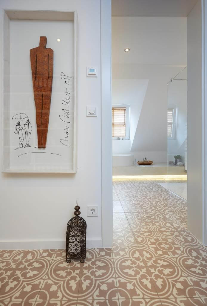 …die Bodenfliesen mit dem marokkanischen Muster ziehen sich durch das Home-Spa bis in den Flur, der ins neue Schlafgemach führt. Dazu legt die Innenarchitektin die ehemaligen Kinderzimmer zusammen…