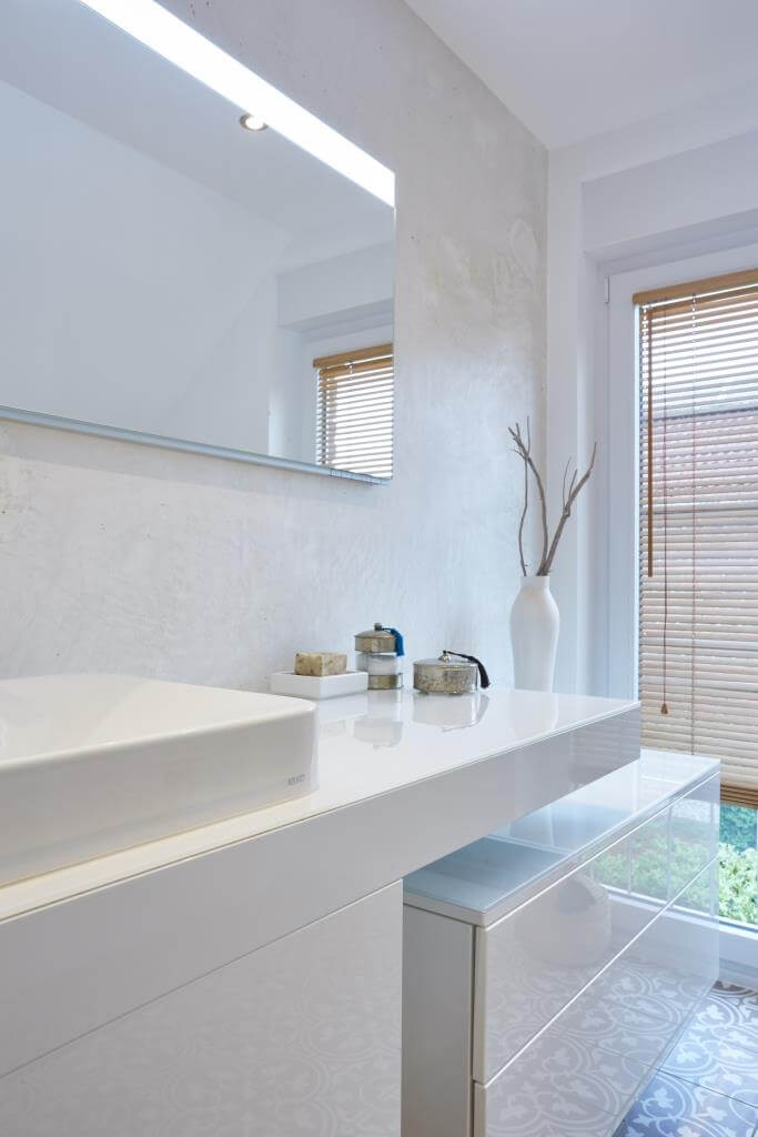 …zu den in Tadelakt verputzten Wänden wählt Bettina Bickert einen Keramik-Waschtisch und weiße, hochglänzende Badmöbel aus Keucos Edition 400…