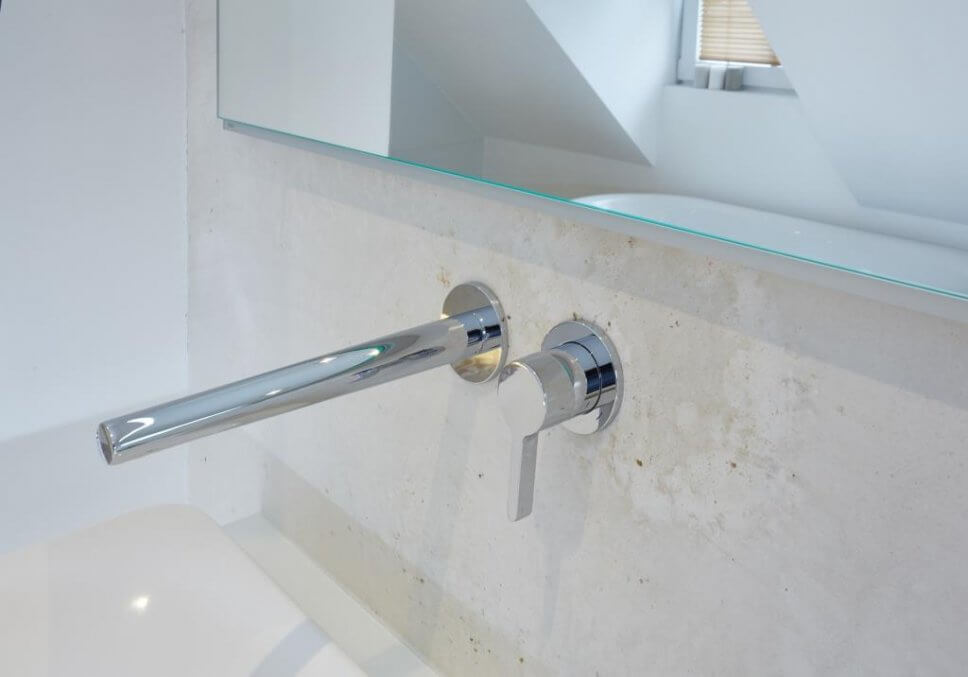 …aus der Edition 400 stammen auch die glänzend verchromten Wandarmaturen, die hier fast wie Skulpturen wirken…