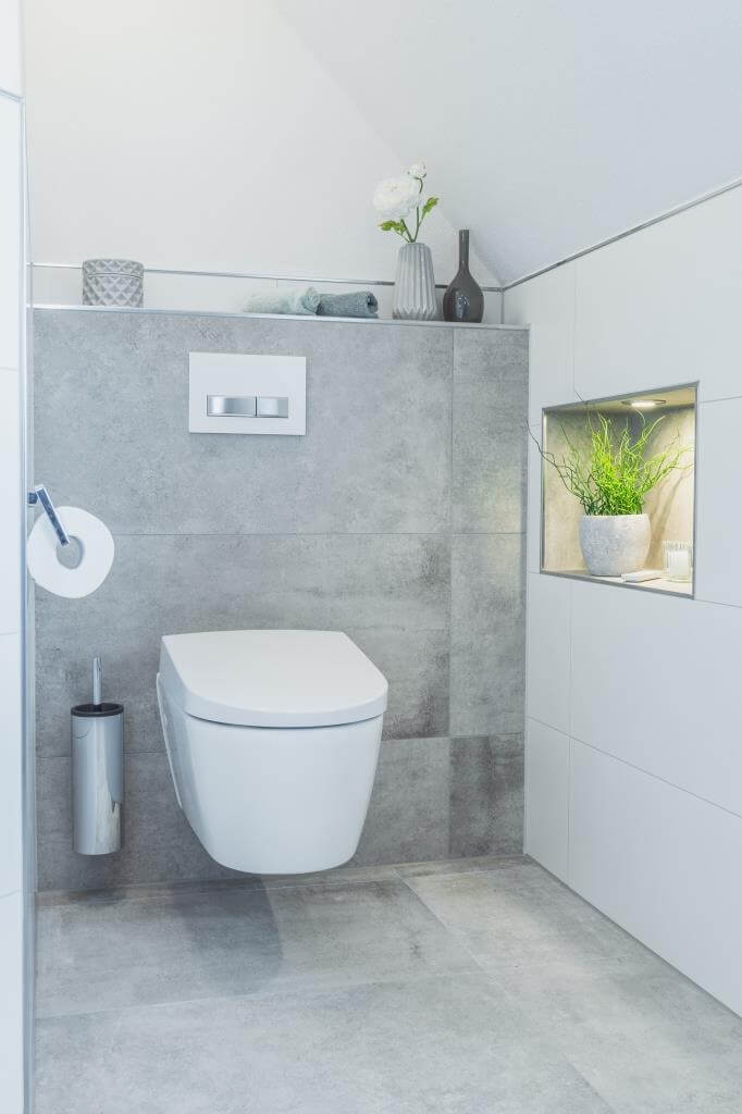 …schöner Nebeneffekt: Die Vorwand verhindert einen direkten Blickkontakt zur Toilette. Und der Freiraum in den Elementen dient elegant als Unterputzlösung für WC-Bürstengarnitur und Toilettenpapierhalter…