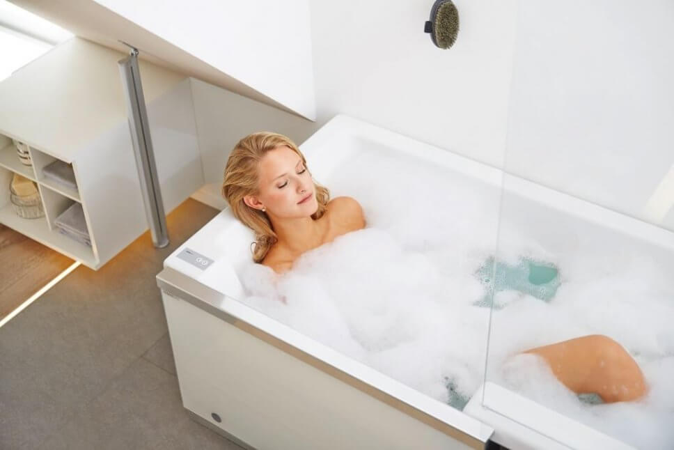 …diese ist großzügige Dusche und geräumige Wohlfühlbadewanne in einem. Steht einem der Wunsch nach einem Vollbad, schließt die elektronische Schiebetür auf Knopfdruck und verriegelt den Durchstieg…