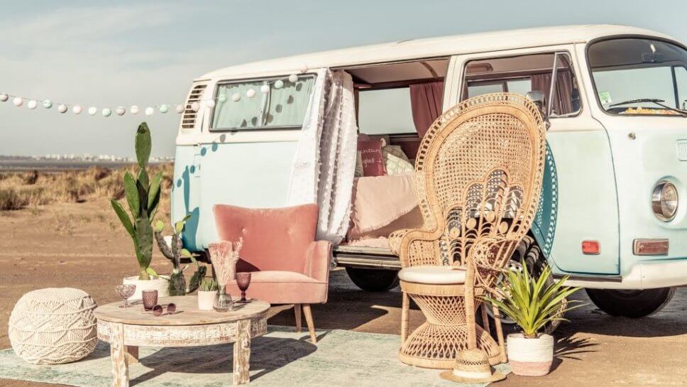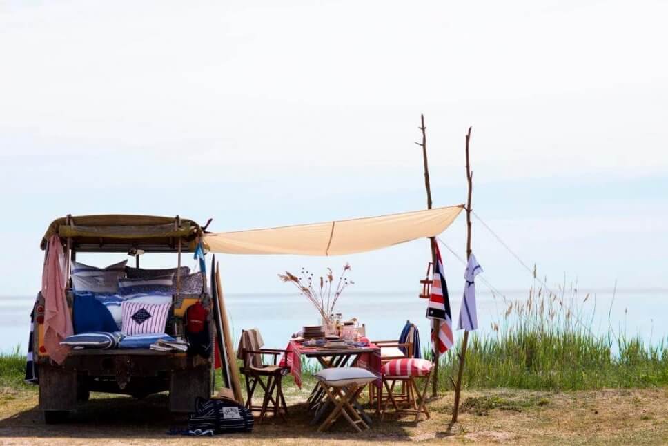 Mit dem Bulli fährt Maisons du Monde auf Glamping-Tour. Da darf der Boho-Chic zwischen den Dünen nicht fehlen…