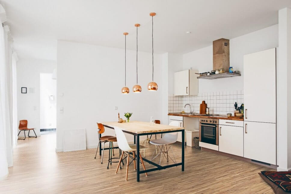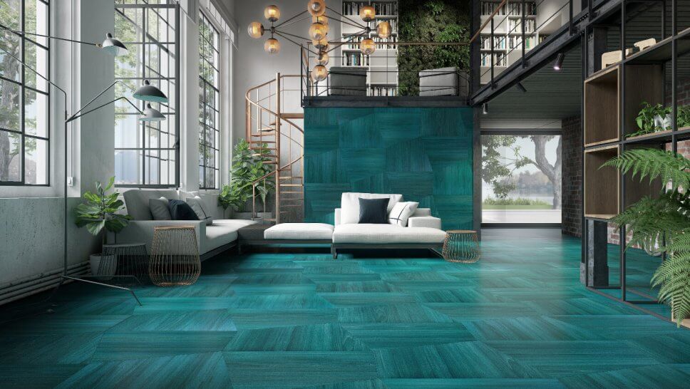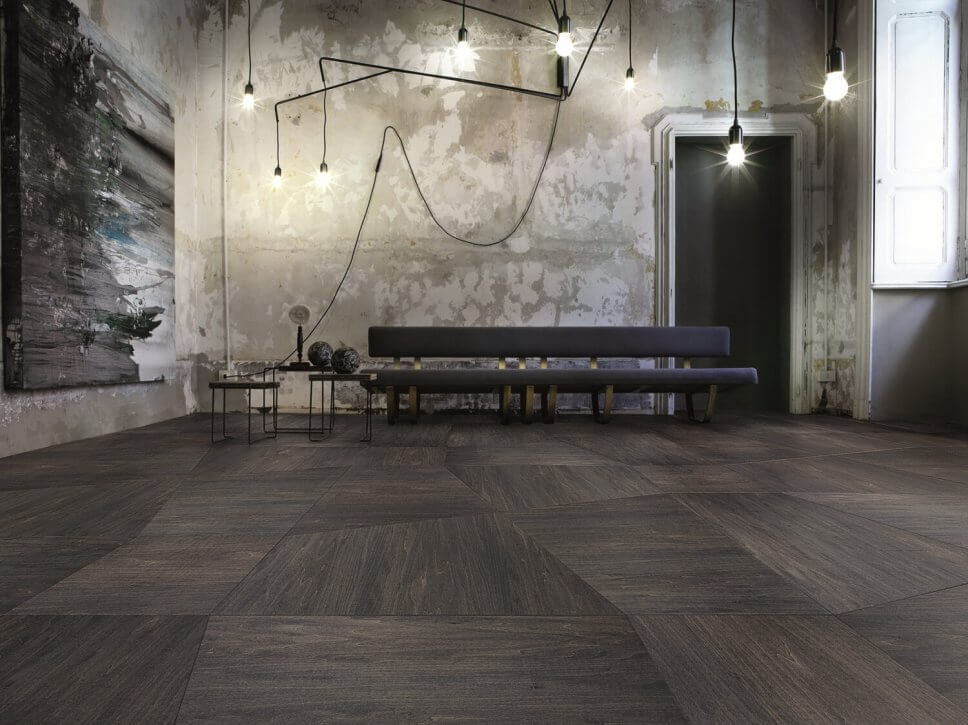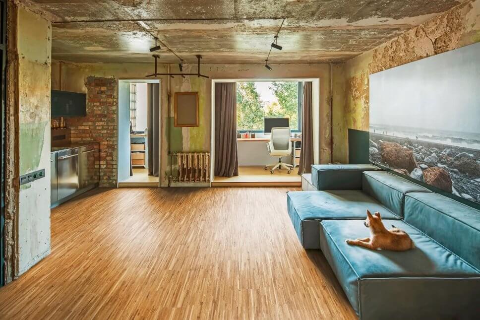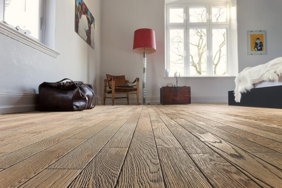 …der Boden aus Birkenholzfasern bekommt so einen rauen Touch im Industrie-Look, ideal fürs Loft