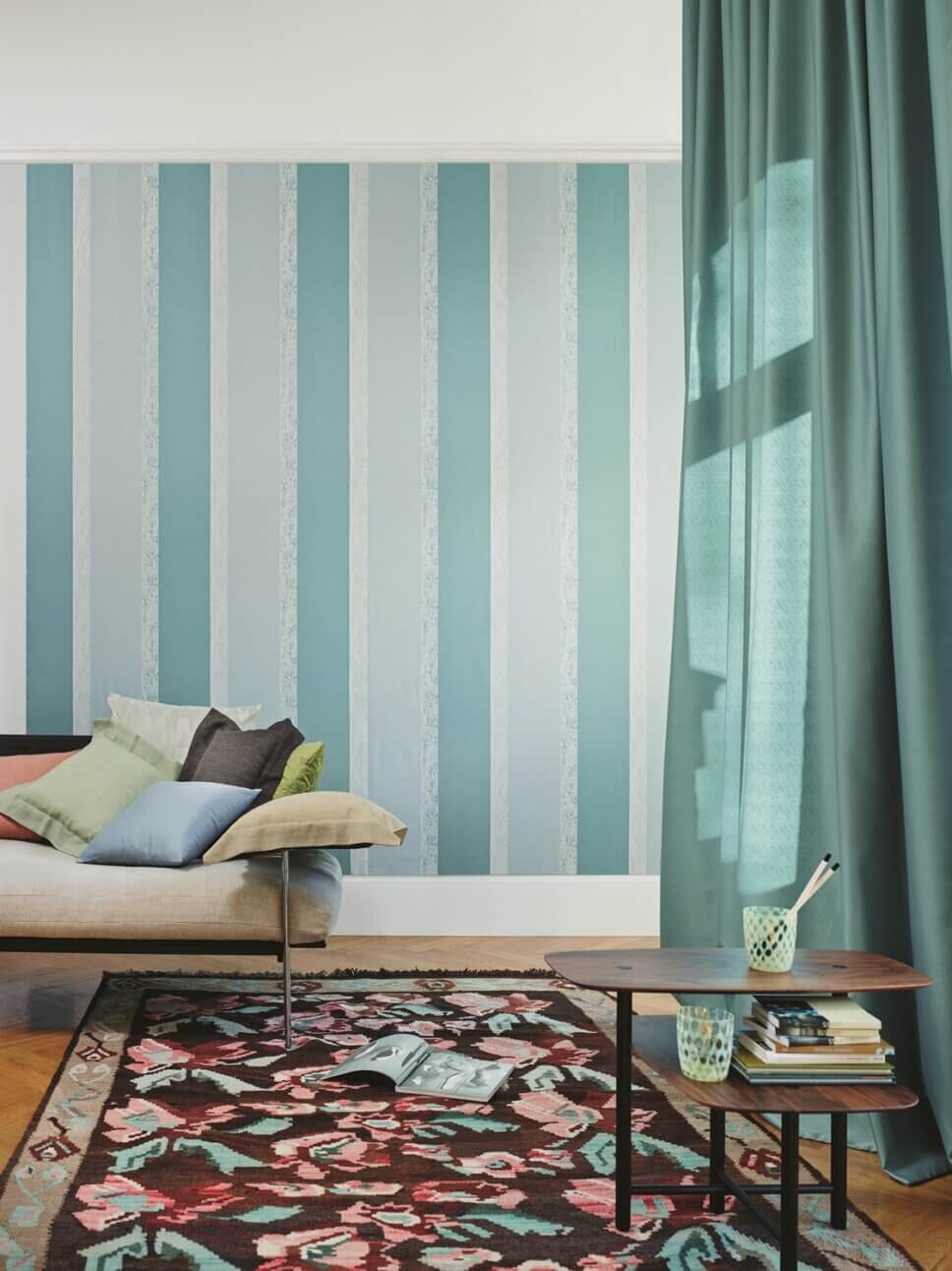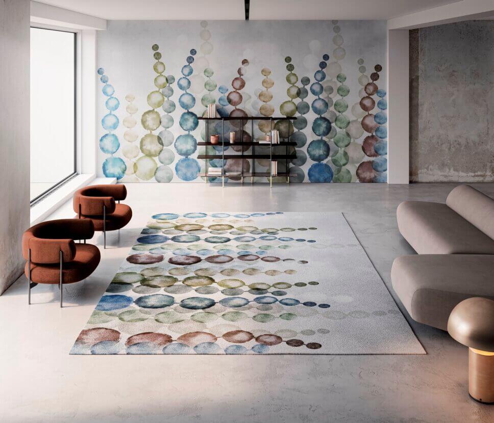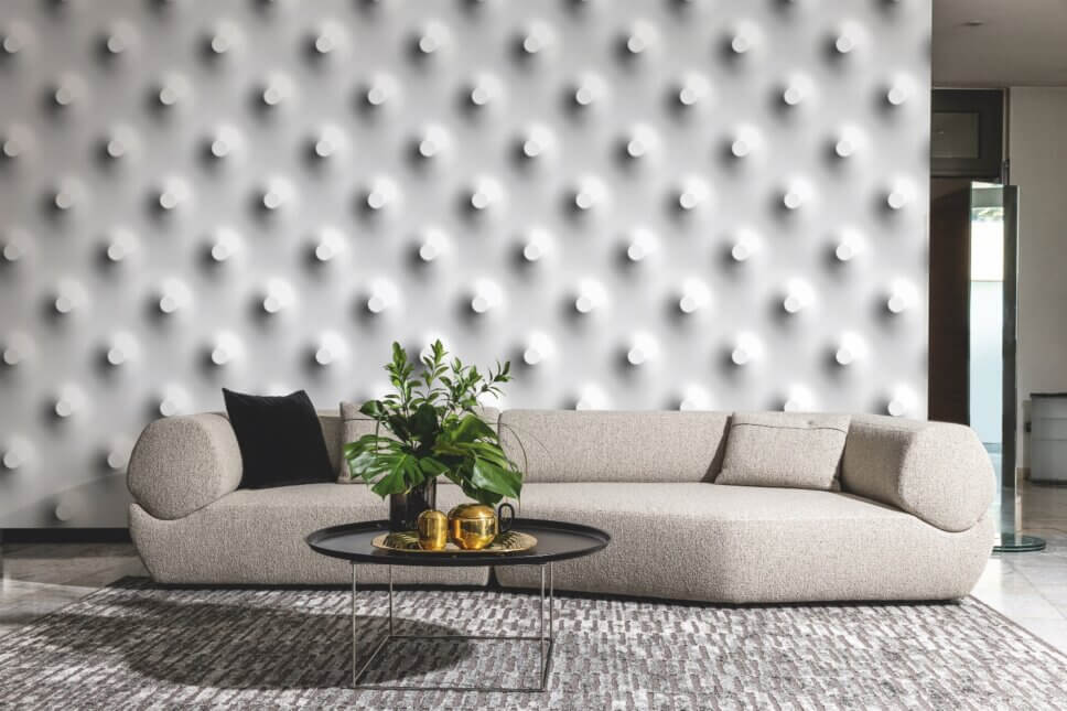 …ihre neue Velluto-Wandrobe hingegen erinnert haptisch an edlen Samt. Das Tapetenmuster setzen sie auf dem Teppich fort…