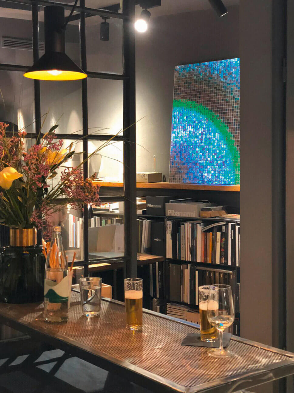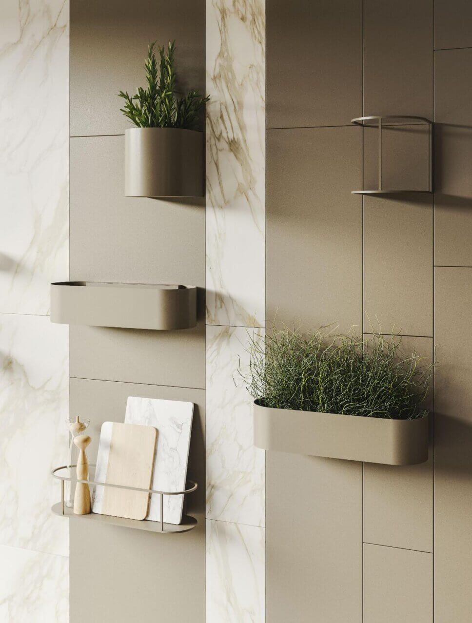 …die neuen Wände aus pulverbeschichtetem Metall nehmen Regale, Leuchten, Spiegel und sogar Blumentöpfe auf…
