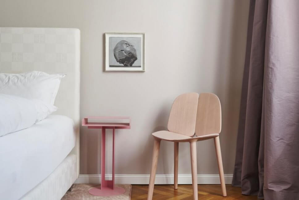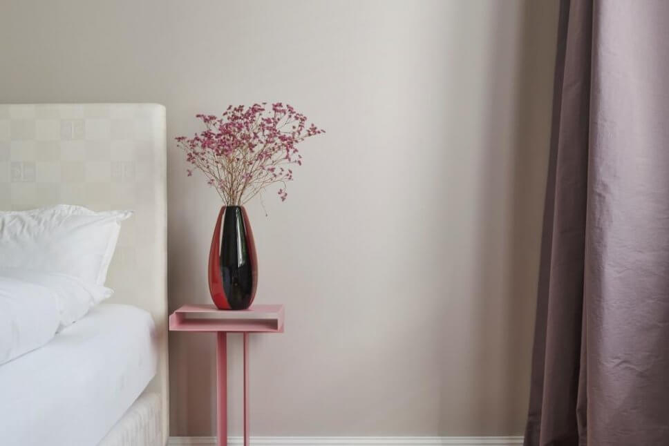 …die Schlafzimmerwand trägt die Nummer 33, Global Gypset, ein Grau-Rosé mit einem Hauch Umbra…