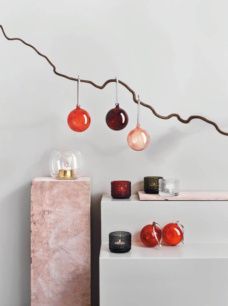 Die mundgeblasenen Glaskugeln von Iittala wirken sowohl am einsamen Ast, wie auch am opulenten Weihnachtsbaum immer elegant reduziert