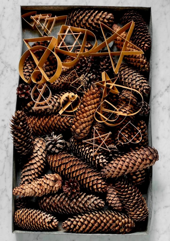 Noch liegen sie auf einem Zapfenbett bereit, die Metall-Anhänger aus der Figura Weihnachtsornamentreihe von Stelton