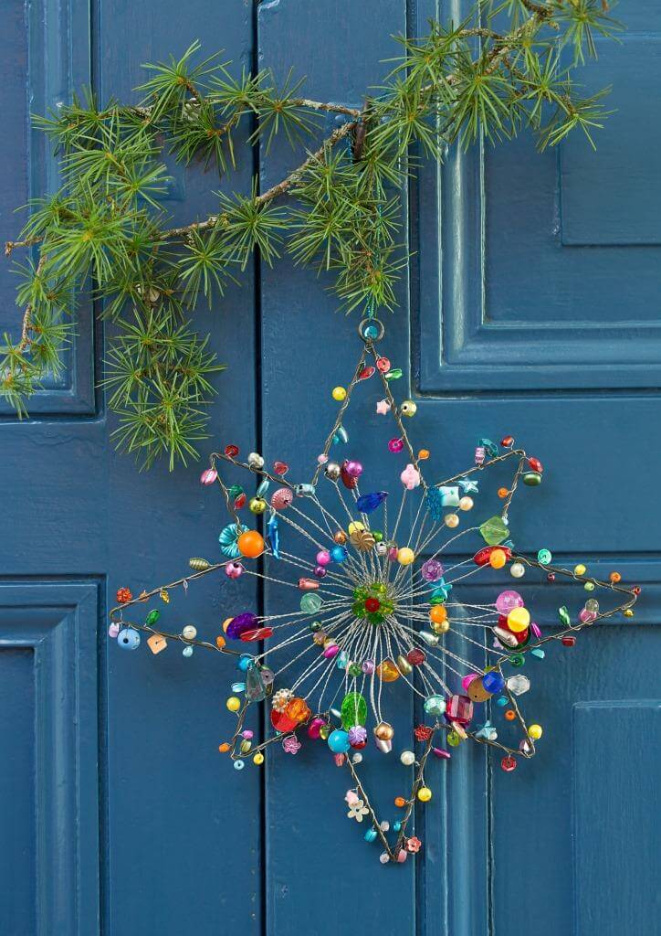 …der Christbaumschmuck aus Glas und Papier ziert einen Zweig, der im Fenster hängt