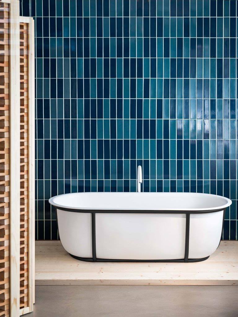 …der Israeli formt die freistehende Badewanne aus Stahl-Email wie eine Skulptur. Der wogende Rand ist an der Rückenlehne hochgezogen und glättet sich wieder am Fußende…