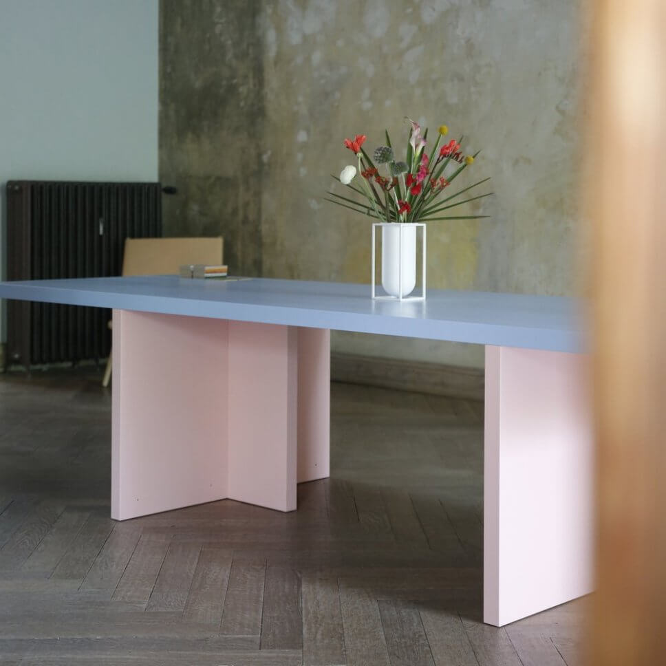 Von architektonischer Strenge und frischer Farbe kommen die Tische von Moritz Bannach daher, auf der Blickfang Hamburg mit dem Future Forward ausgezeichnet