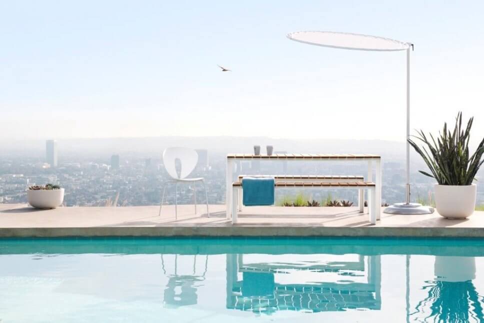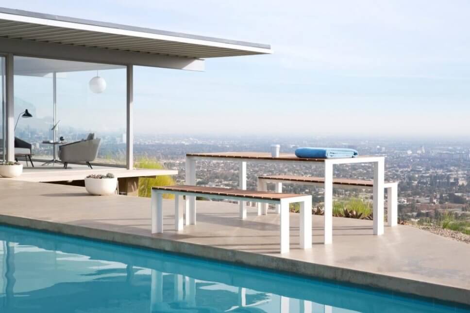 …vom Pool aus blickt man über die Weite der Stadt. Davon lenkt auch die schlicht-schöne Bank-Tischkombination Deneb Teka aus Alu und Teak von Jesús Gasca nicht ab…