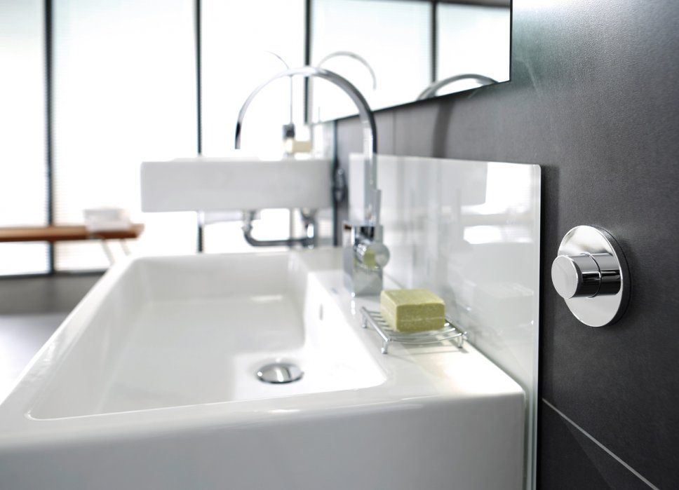 Ruckzuck ist der Waschtisch auf bequemster Position: Per Knopfdruck fährt die Keramik dank der Eco Plus-Elemente von Viega nach oben. Ein Auflehnen der Hände bewegt sie nach unten