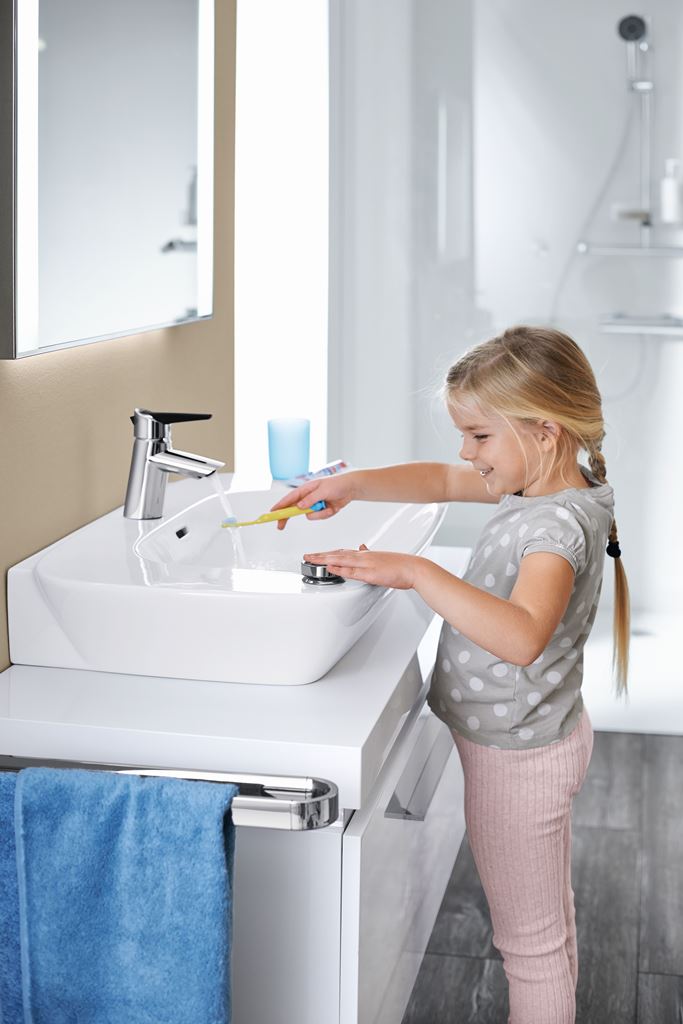 Mit der smarten Drucktaste für die One-touch-Bedienung geht das Händewaschen kinderleicht. Die Temperatur lässt sich bei Hansafit voreinstellen. Der Wasserfluss stoppt automatisch. Das spart Energie und kostbares Nass