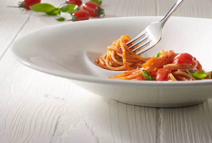 Mit den Tellern der Pasta Passion von Villeroy & Boch macht Nudelessen jedem Spaß. Ohne zu Kleckern lässt sich die Spaghetti einfach in der Wölbung des Tellers aufdrehen, das Besteck rutschfest in einer Mulde ablegen