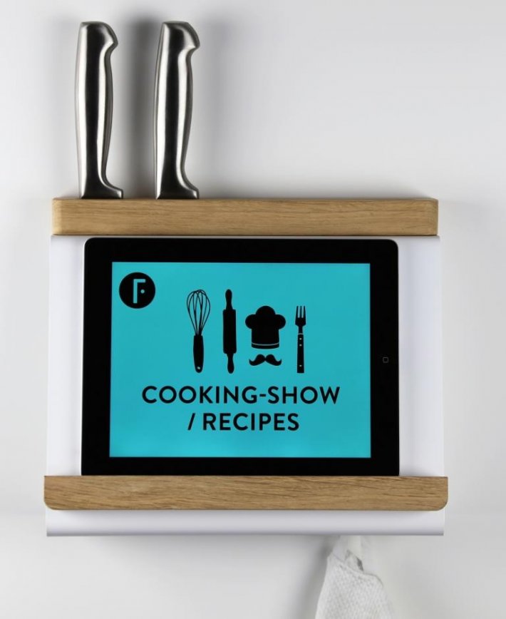 Tabilo, erdacht von Studiofaubel, passt perfekt in die Küche. Der Tablethalter der Müller Möbelfabrikation sorgt aber nicht nur für Online-Kochrezepte in Augenhöhe, er dient zugleich als Messerblock und Handtuchhalter