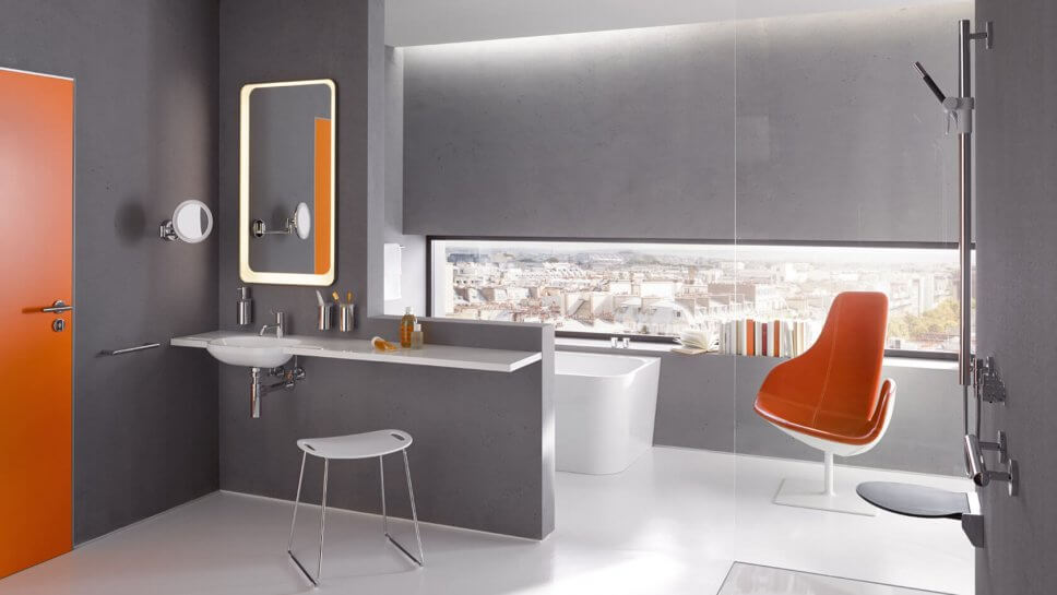Formschön fällt einem als erstes beim Anblick von Hewis barrierefreien Waschtischen ein. Darunter hat ein praktischer Hocker oder ein Rollstuhl Platz. Die Haltegriffe machen sich auch als Handtuchhalter nützlich