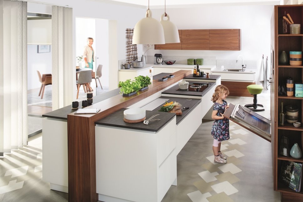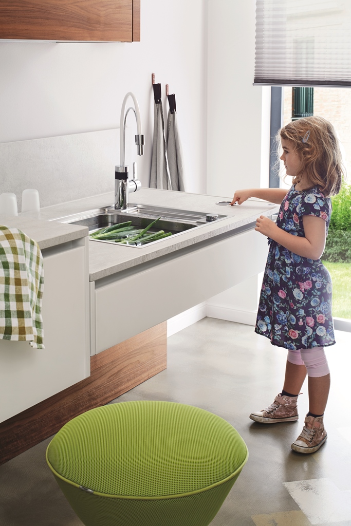 …je nachdem, wer abwäscht, lässt sich zum Beispiel die Spüle auf die bequemste Position für Mama wie fürs Töchterchen einstellen. Dank elektrischer Unterstützung öffnen sich Schübe und Auszüge durch Antippen mühelos