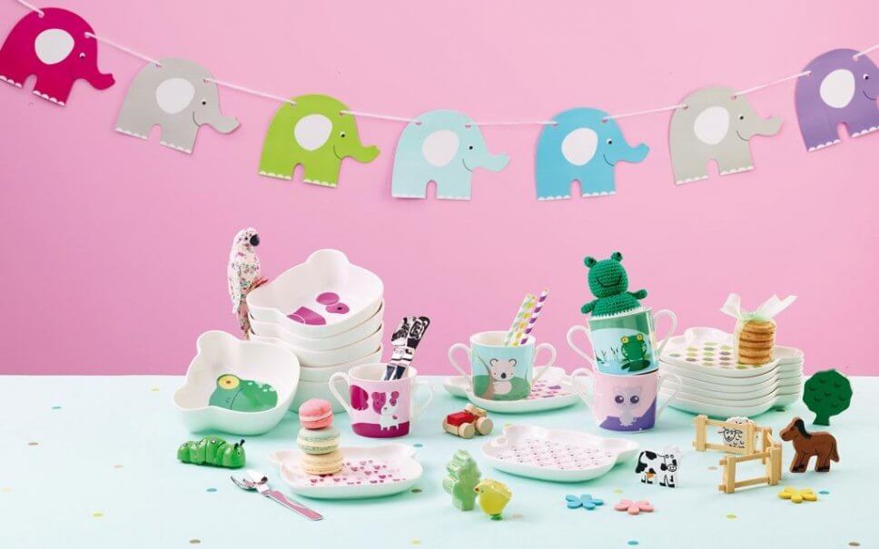 Tierische Mitesser auf Sambonets Kindergeschirr sorgen selbst beim Spinat Essen für gute Laune