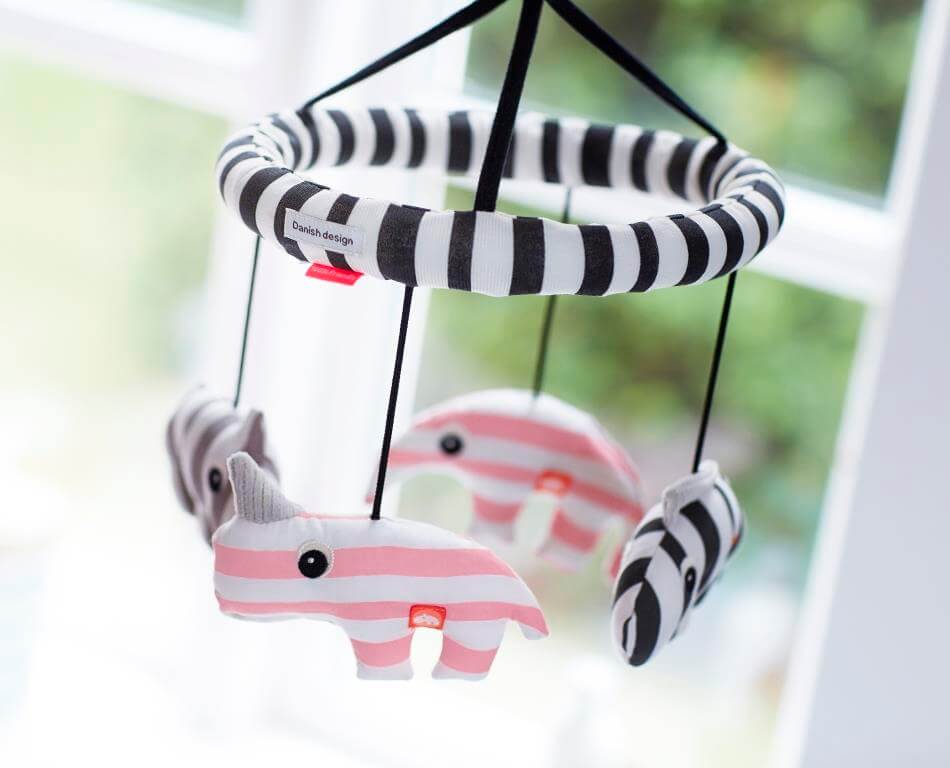Nashorn, Nilpferd und Co. singen dem Sprössling sanft mit der Melodie von Hush Little Baby in den Schlaf. Natürlich können die Mobile-Tiere von Done by Deer auch bespielt werden…