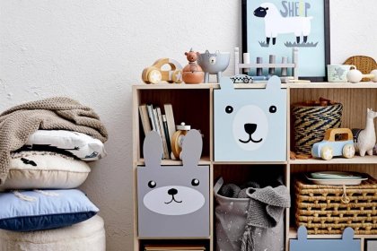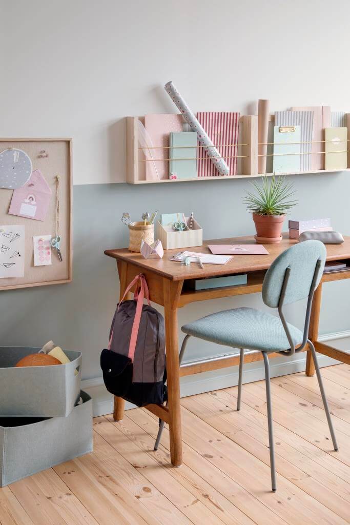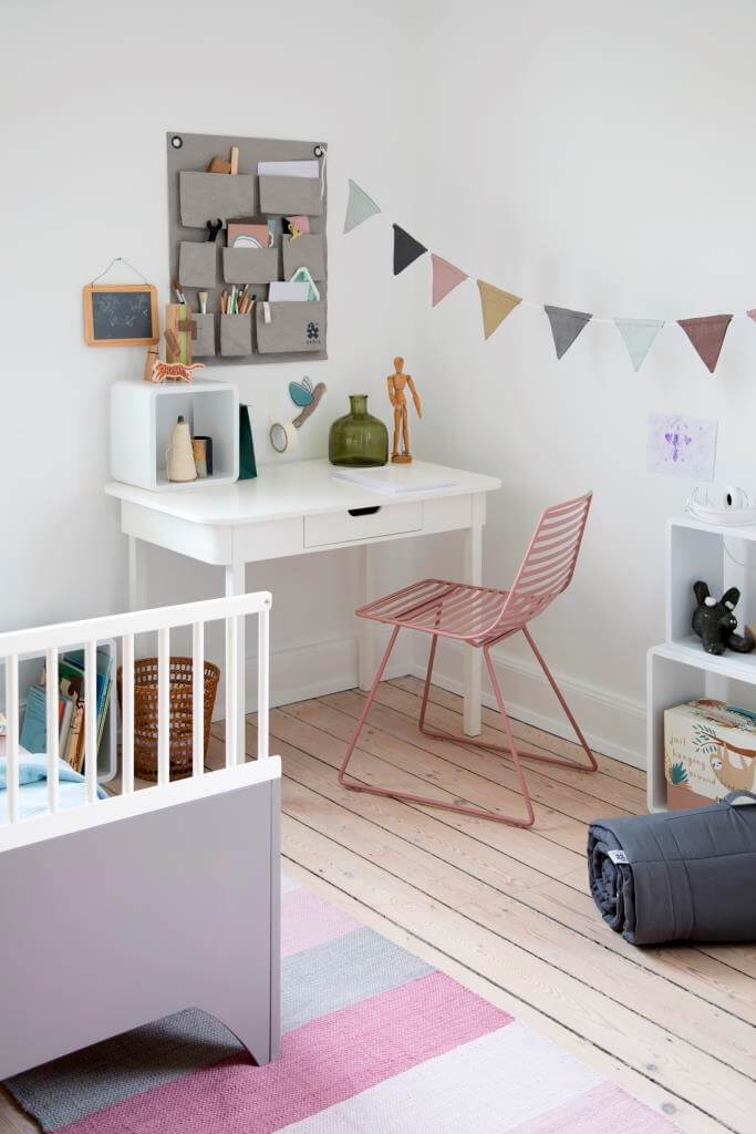 Mit kleinen Regalboxen und einem Utensilo lässt sich der erste Schreibtisch (hier von Sebra) leicht ordentlich halten…