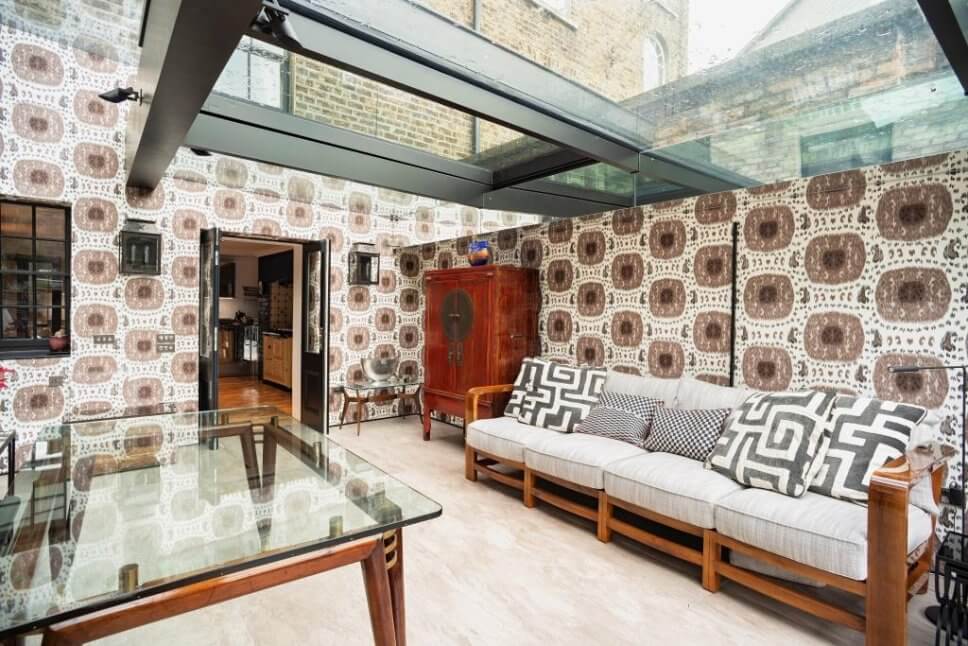 …ein chinesischer Hochzeitsschrank parliert hier mit einem Mid-Century-Sofa vor einem opulent gemustertem Wandkleid…