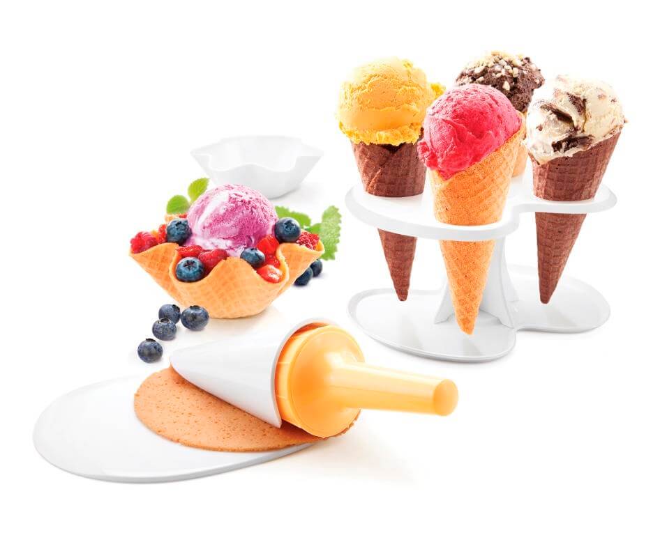 Was wäre eine leckere Kugel Eis ohne Hörnchen! Auch das wird jetzt selbstgemacht – ganz einfach mit dem Della Casa-Set von Tescoma mit vier Spezial-Backfomen, Spachtel, Former, Stampfer und Waffel-Ständer…