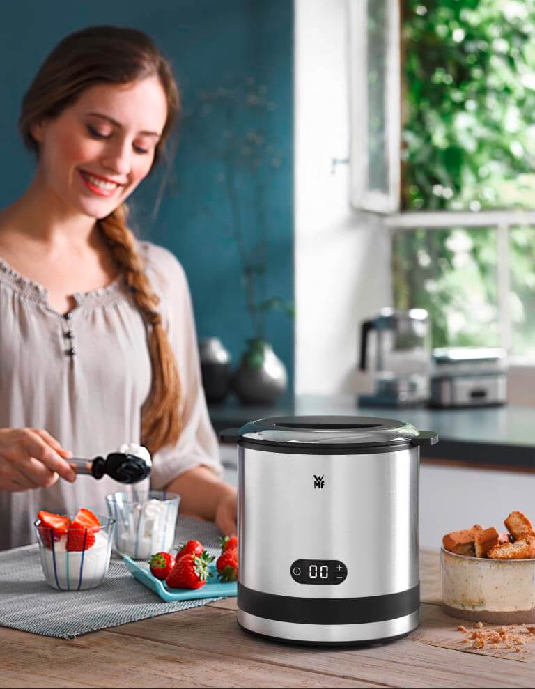 Mit der kompakten Drei-in-Eins-Eismaschine von WMF lässt sich dreierlei Gefrorenes fertigen – Eis, Sorbet und Frozen Yoghurt. Bevor es losgeht, muss der Gefrierbehälter im Eisfach auf minus 18 Grad Celsius heruntergekühlt werden