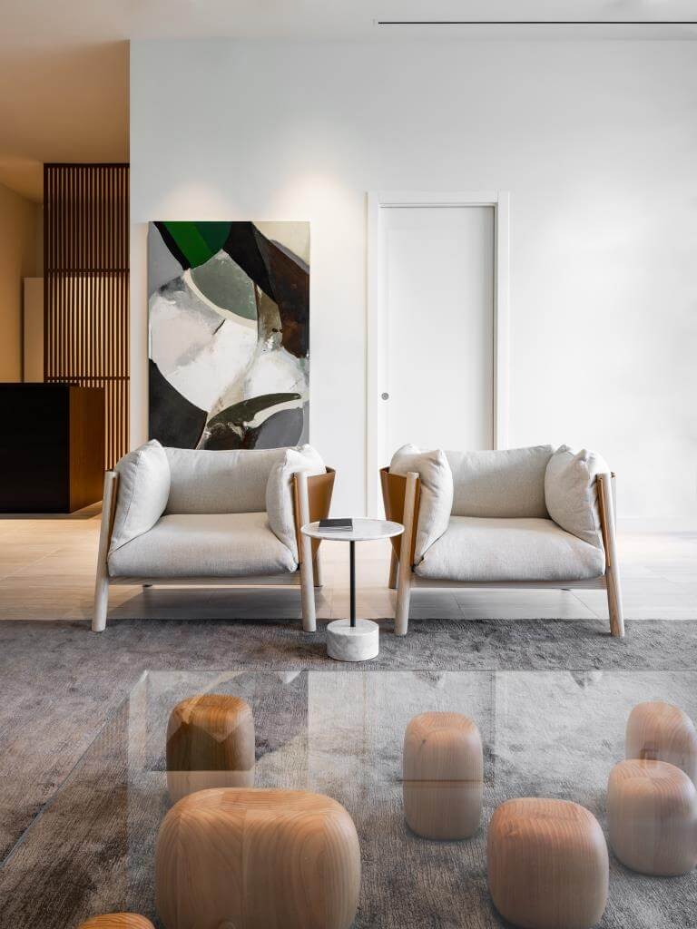 …Nendos Couchtisch Ishi auf seinen elf Zedernholz-Steinen schlägt die Verbindung zu Lucidi Peveres Yak-Sesseln…