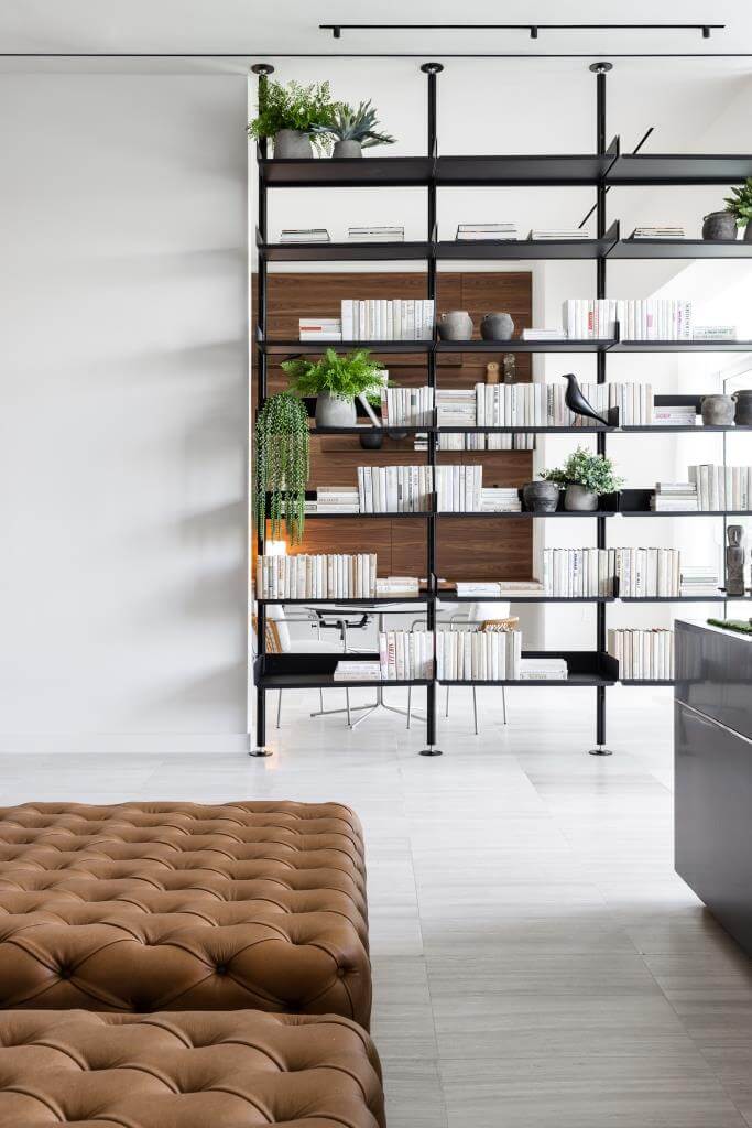 …das zeitlose 606 Universal Shelving System von De Padova grenzt die Kochstätte galant vom Wohnbereich ab…