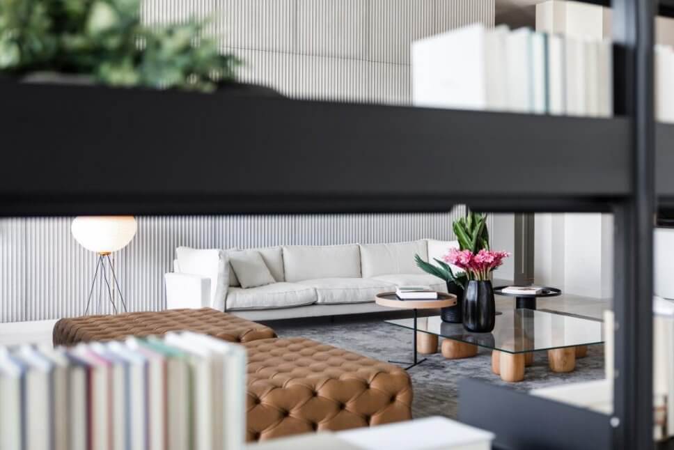 …hier parliert das Sofa Square 16 mit den kapitonierten Lederpoufs, illuminiert von Keiji Takeuchis Twig-Stehleuchte und Isamu Noguchis legendären Akari Lichtskulpturen für Vitra…