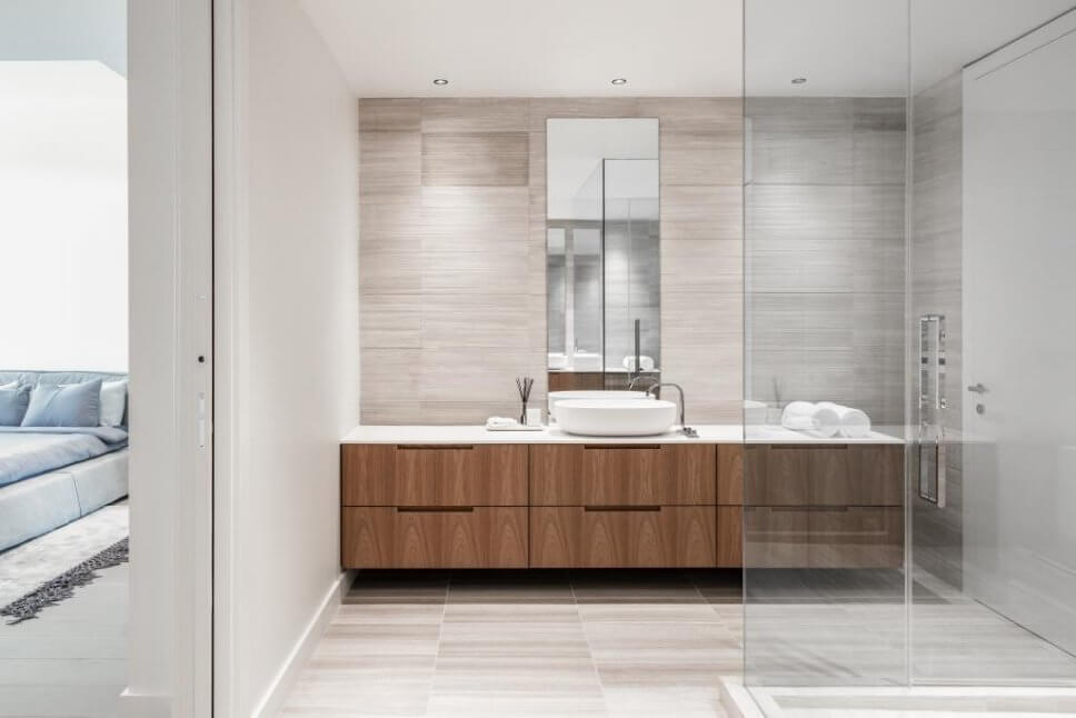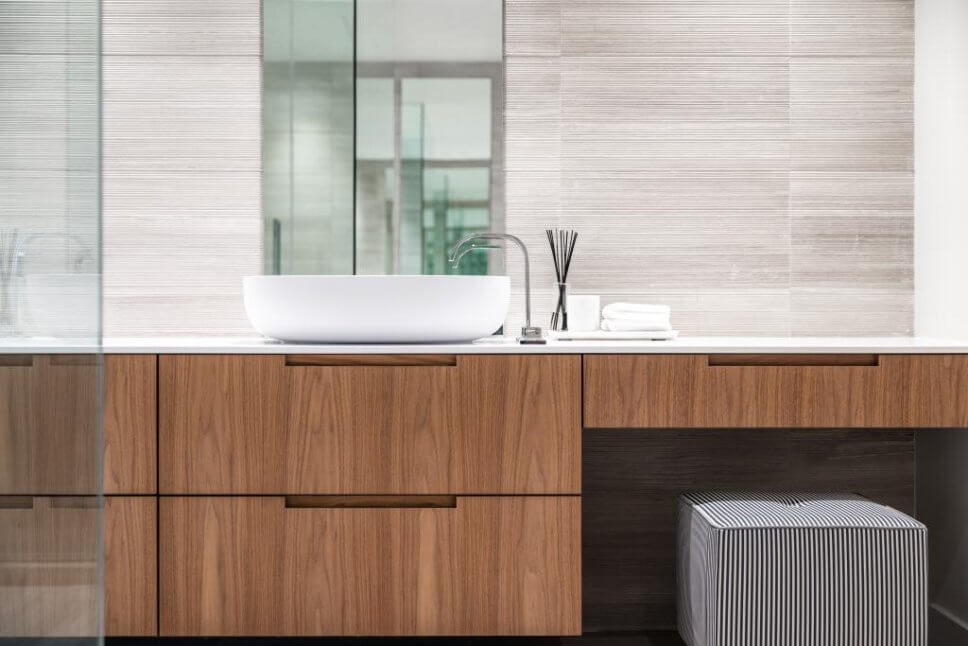 …das Aufsatzbecken krönt das markant gemaserte Holz des Badmöbels, das sogar noch Raum für einen Sitzplatz zum Schminken bietet