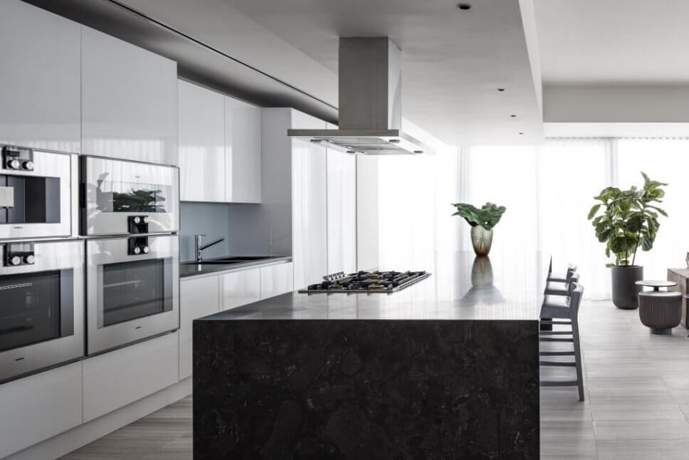 …die überbreite Steinarbeitsplatte rahmt die reinweiße Kochinsel kontrastierend ein…