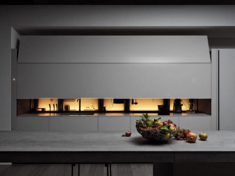 Valcucine modifiziert sein Logica System, einst nur elegantes Zubehörfach zwischen Unterschrank und Rückwand auf Höhe der Arbeitsplatte: Fast wir von Zauberhand öffnet sich bei Logica Celata die Front dank eines hochentwickelten Mechanismus‘ mit Gegengewichten