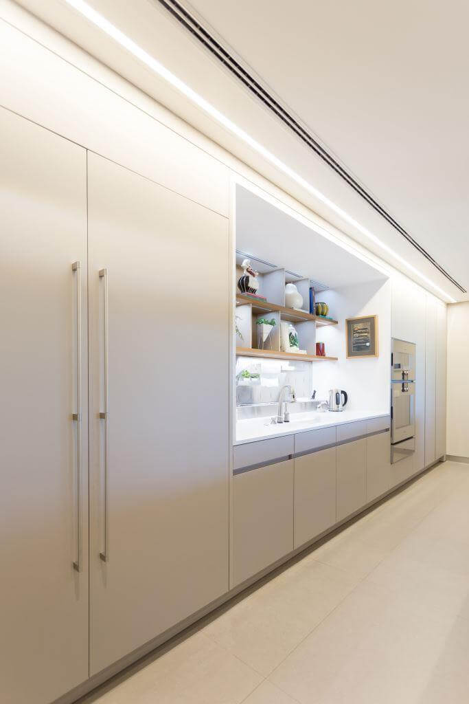 …zu beiden Seiten der markanten Vorbereitungsnische bieten bis an die Decke reichende Hochschränke opulenten Stauraum
