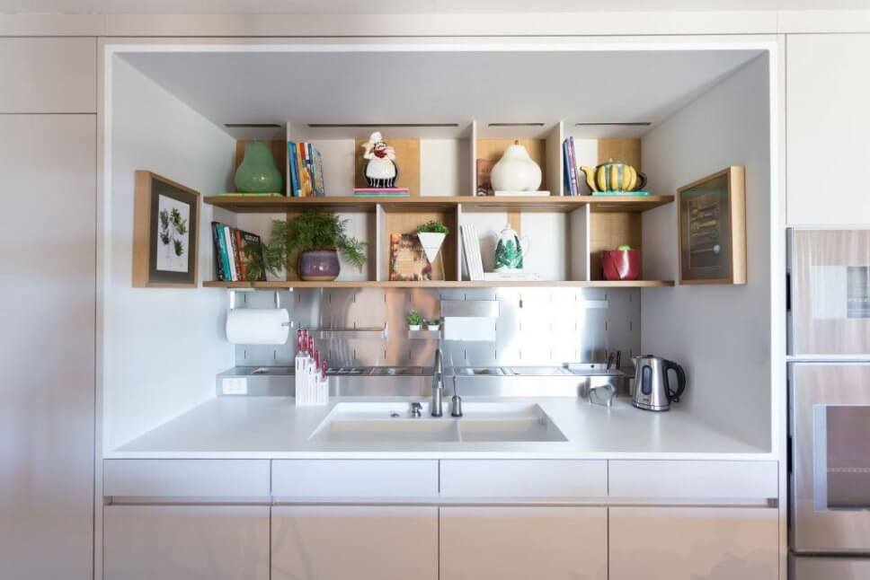 …eine großzügige Nische mit Spülbecken und Ablageflächen ist als separierte Zone analog eines Bilderrahmens in die Wand eingefasst…